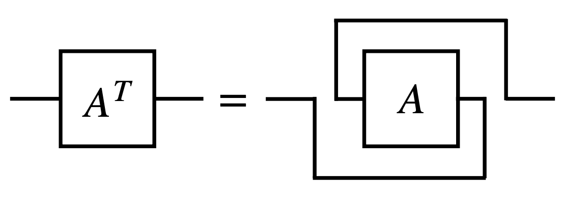 의미 없는 복잡한 표현처럼 보이지만, 사실은 간단한 철학이 숨어 있습니다. 행렬 $A$의 transpose $A^T$는 행과 열이 바뀐 행렬입니다. tensor network diagram에서 행렬 $A$는 왼쪽에서 선이 들어오고 오른쪽에서 선이 나가는 도형으로 표현됩니다. 따라서 transpose $A^T$는 선의 방향이 바뀌어 오른쪽에서 선이 들어오고 왼쪽에서 선이 나가는 도형으로 표현됩니다. 사각형을 180도 뒤집어서 회전시키면 되겠지만, tensor network diagram에서는 도형을 놔둔 채로 선을 뒤집어서 내보내는 방식으로 표현합니다.