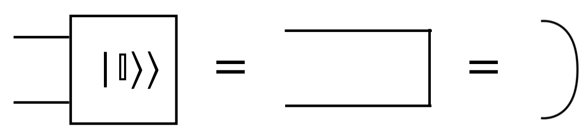 드디어 tensor network diagram에서 vectorization을 어떻게 표현하는지 살펴볼 차례입니다. $\vert \Omega \rangle = \vert I \rangle\rangle$ 의 tensor network diagram 표기법은 아래와 같습니다.