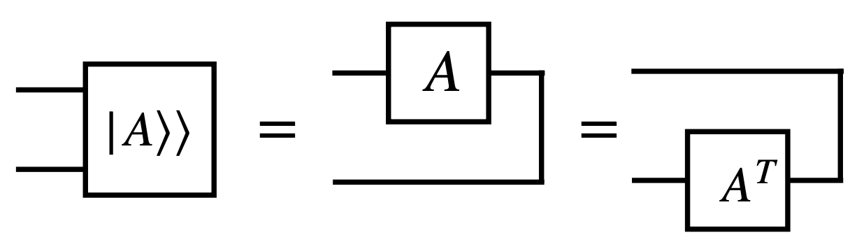 만약 행렬 A가 $A \in L(\mathbb{C}^d) \otimes L(\mathbb{C}^{d’})$ 에 속하는 행렬이라면, vectorization 결과는 $\vert A \rangle\rangle \in \mathbb{C}^d \otimes \mathbb{C}^{d’} \otimes \mathbb{C}^d \otimes \mathbb{C}^{d’}$ 에 속하는 벡터가 됩니다. tensor network diagram 표기법은 다음과 같습니다.