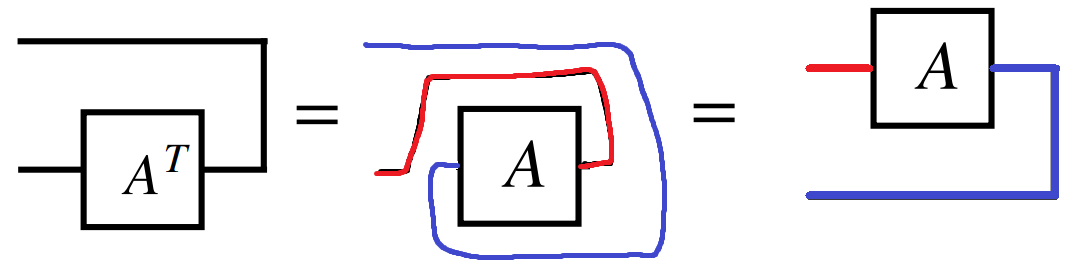(관찰 6) tensor network diagram에서 행렬을 밀어서 밑으로 보내면 전치 행렬이 된다. 다시 밑에서 위로 올리면 원래 행렬이 된다.