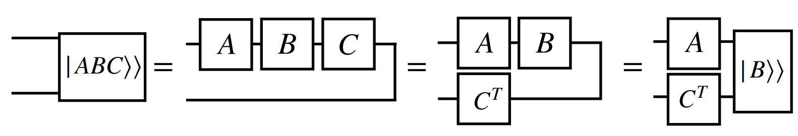 하지만 tensor network diagram에서는 이 관계가 직관적으로 이해됩니다. 그림 5-1의 가운데 figure을 봅시다. 행렬 A를 오른쪽으로 밀어서 넘겨주면 자연스럽게 뒤집히게 되고, 선의 방향이 바뀌면서 transpose가 되는 것입니다. 즉, tensor network diagram에서는 vectorization의 두 표현이 동일하게 보이기 때문에 자연스럽게 성립하는 관계가 되는 것입니다. 이 옮김을 자연스럽게 해보면 ABC rule 을 얻습니다.
