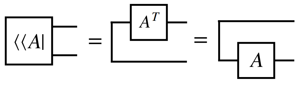 \[\langle \langle A \vert = \langle \Omega \vert A \otimes I = \sum_{i=1}^{d} \langle i \vert \otimes \langle i \vert A\]Row vectorization 의 tensor network diagram 표기법은 다음과 같습니다.