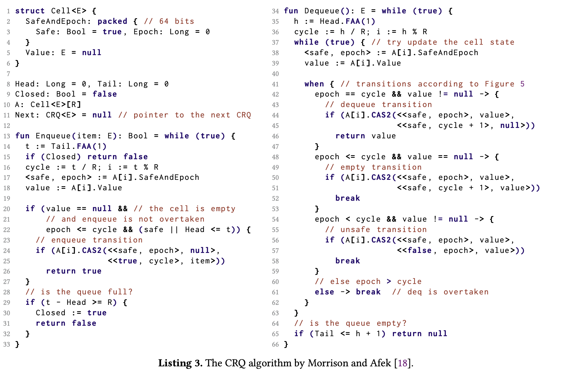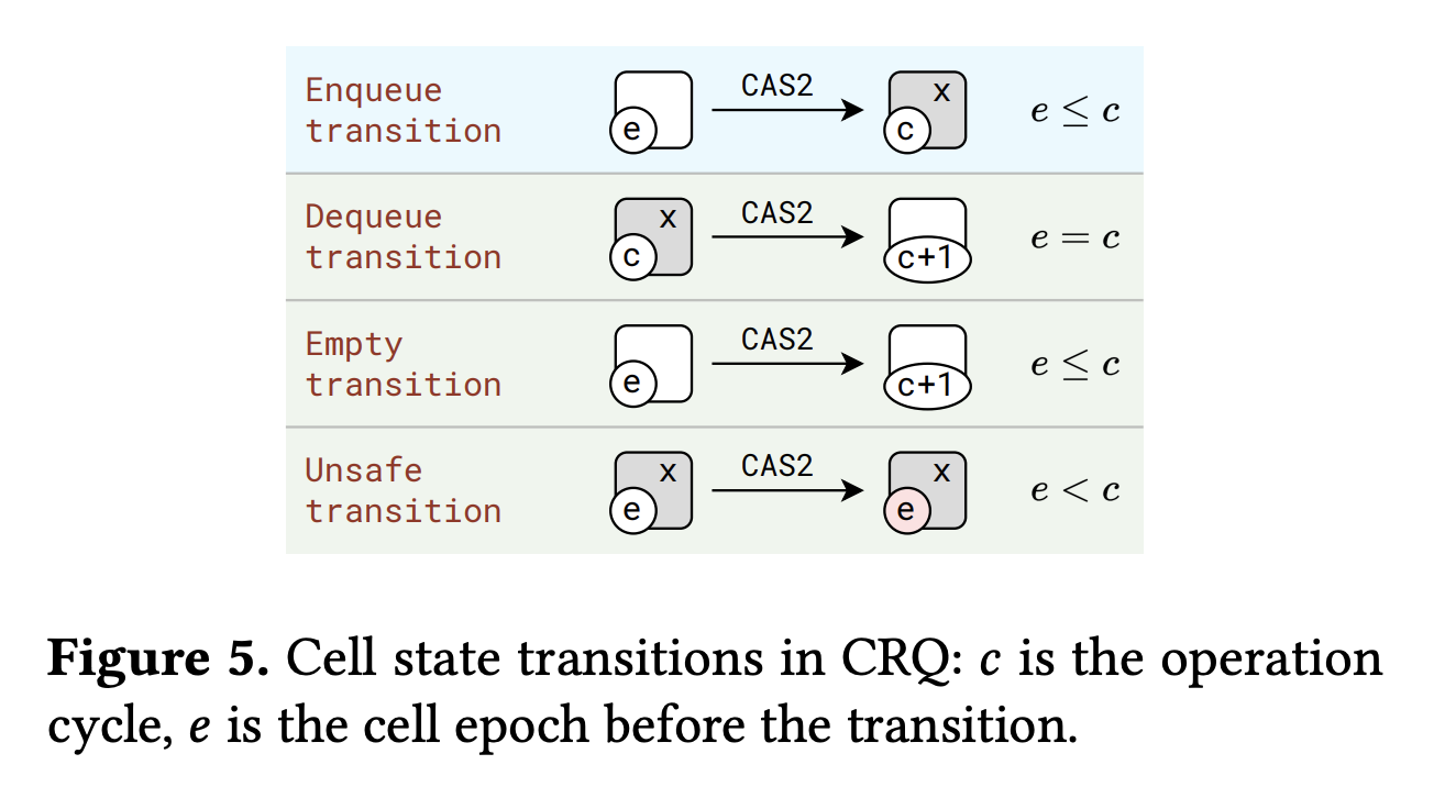 또한 오리지널 LCRQ는 epoch와 value를 함께 관리하기 위해 double-width CAS를 사용합니다. 이를 피하기 위해 표준 single-width CAS만 사용하는 LPRQ와 같은 변형 알고리즘도 존재합니다.